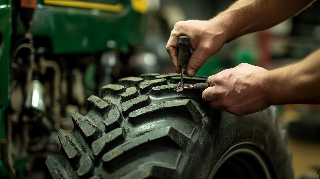Le démonte-pneu constitue un investissement judicieux pour éviter d'endommager la jante ou le nouveau pneu lors du montage. Prévoyez également un manomètre de qualité pour vérifier et ajuster la pression du pneumatique, ainsi qu'un lubrifiant spécifique pour faciliter le montage du pneu sur la jante. Ce lubrifiant, spécialement conçu pour les pneus, protège les talons et permet une installation plus aisée. N'oubliez pas de porter des gants de protection robustes et des lunettes de sécurité, car les opérations de démontage et de gonflage présentent des dangers potentiels. Enfin, gardez à portée de main le manuel de votre tracteur John Deere qui contient les spécifications exactes concernant les dimensions de pneus compatibles et les pressions recommandées.